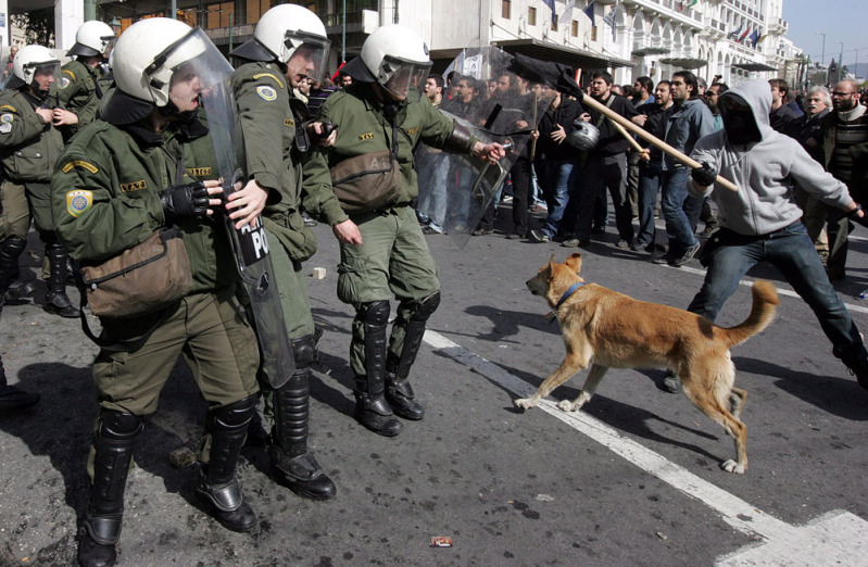 Διεθνή καριέρα κάνει ο "Λουκάνικος", ο σκύλος που δεν χάνει διαδήλωση στην Αθήνα.